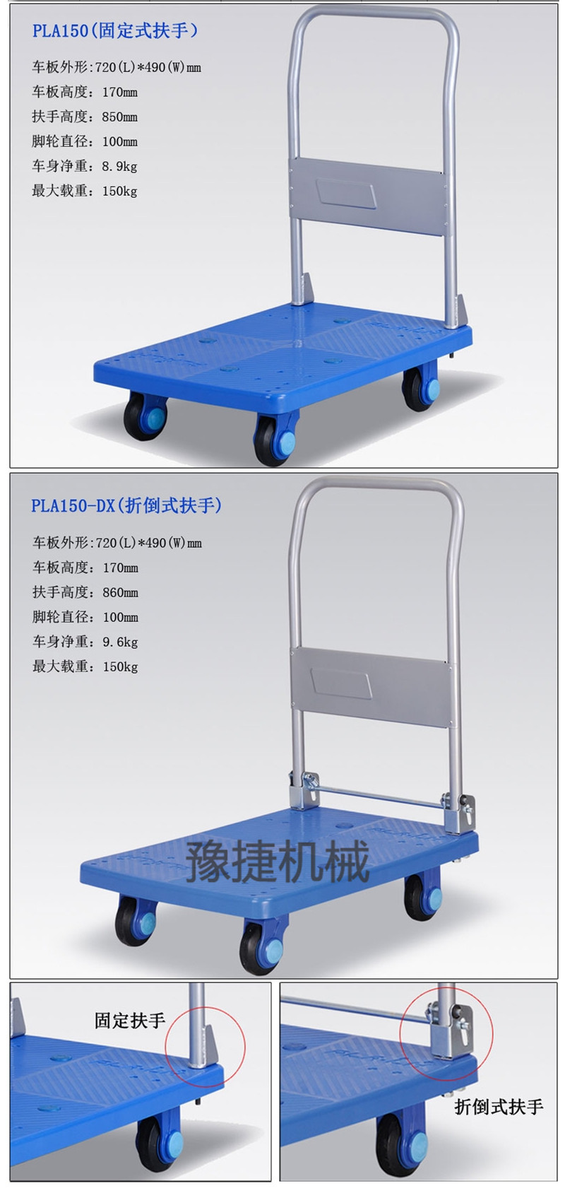 【豫捷】平板手推车由塑料车板、粉体涂装扶手(可折倒、固定)、静脚轮(尼龙支架、铁板支架)等组成。